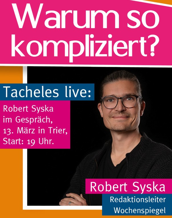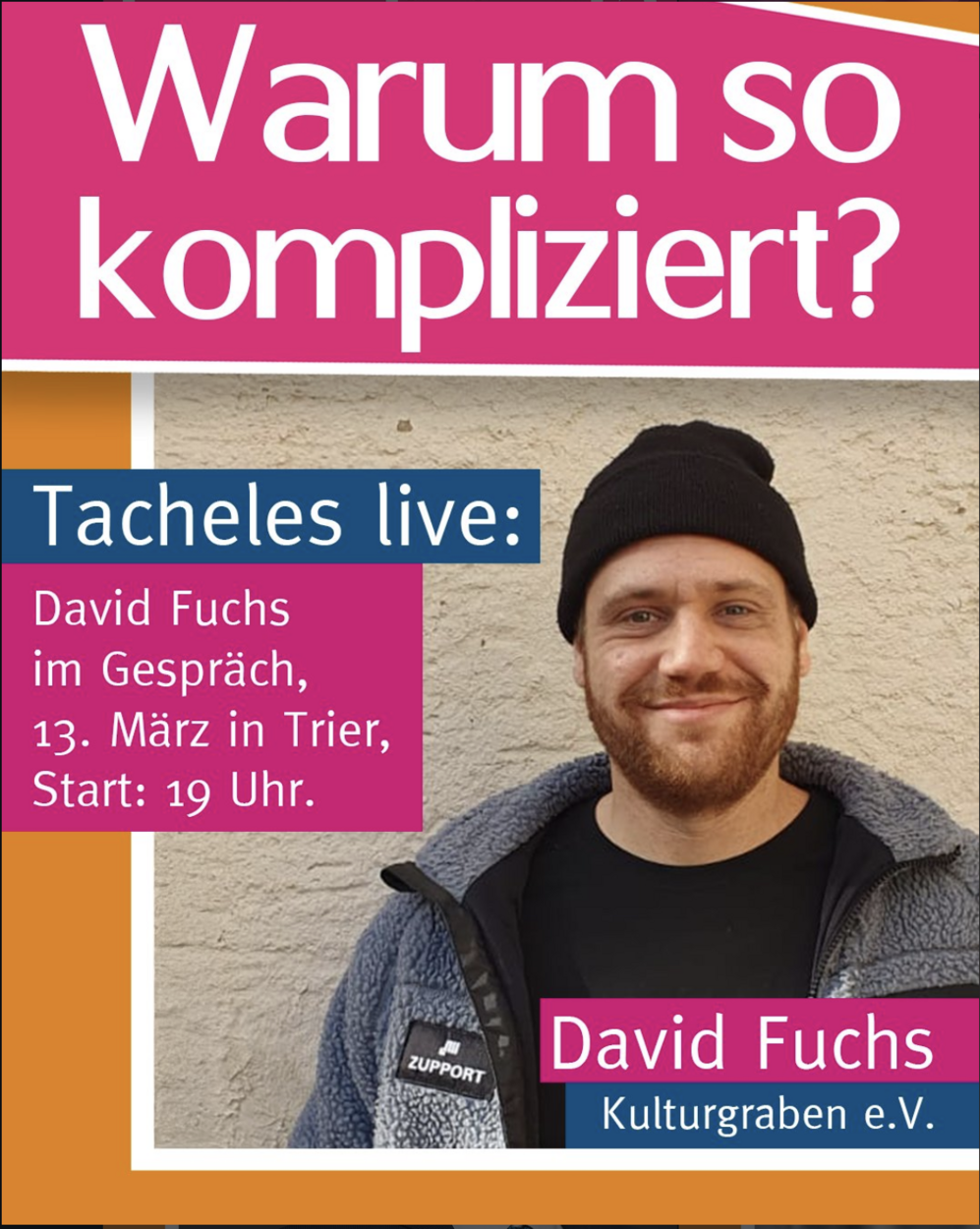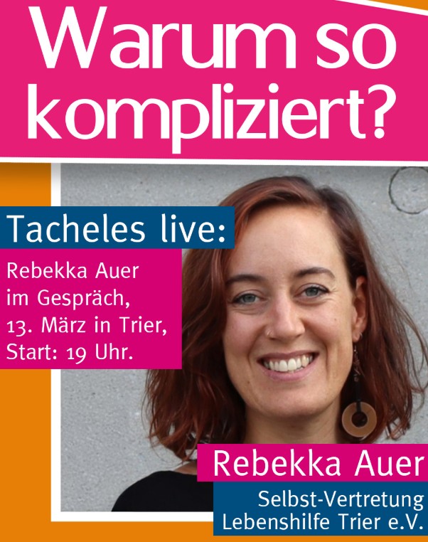 Zum Abschluss einer fünfjährigen Förderphase präsentiert das inklusive Medien-Team TACHELES seine Arbeit in einer besonderen Ausstellung. Unter dem Titel „Warum so kompliziert?“ lädt die Redaktion des Medien-Teams der Lebenshilfe Trier e.V. dazu ein, inklusive Medienarbeit hautnah zu erleben. Die Ausstellung findet vom 11. bis zum 21. März im „Kafé Südachse“ des Kulturgraben e.V. in der Saarstraße 9 statt.