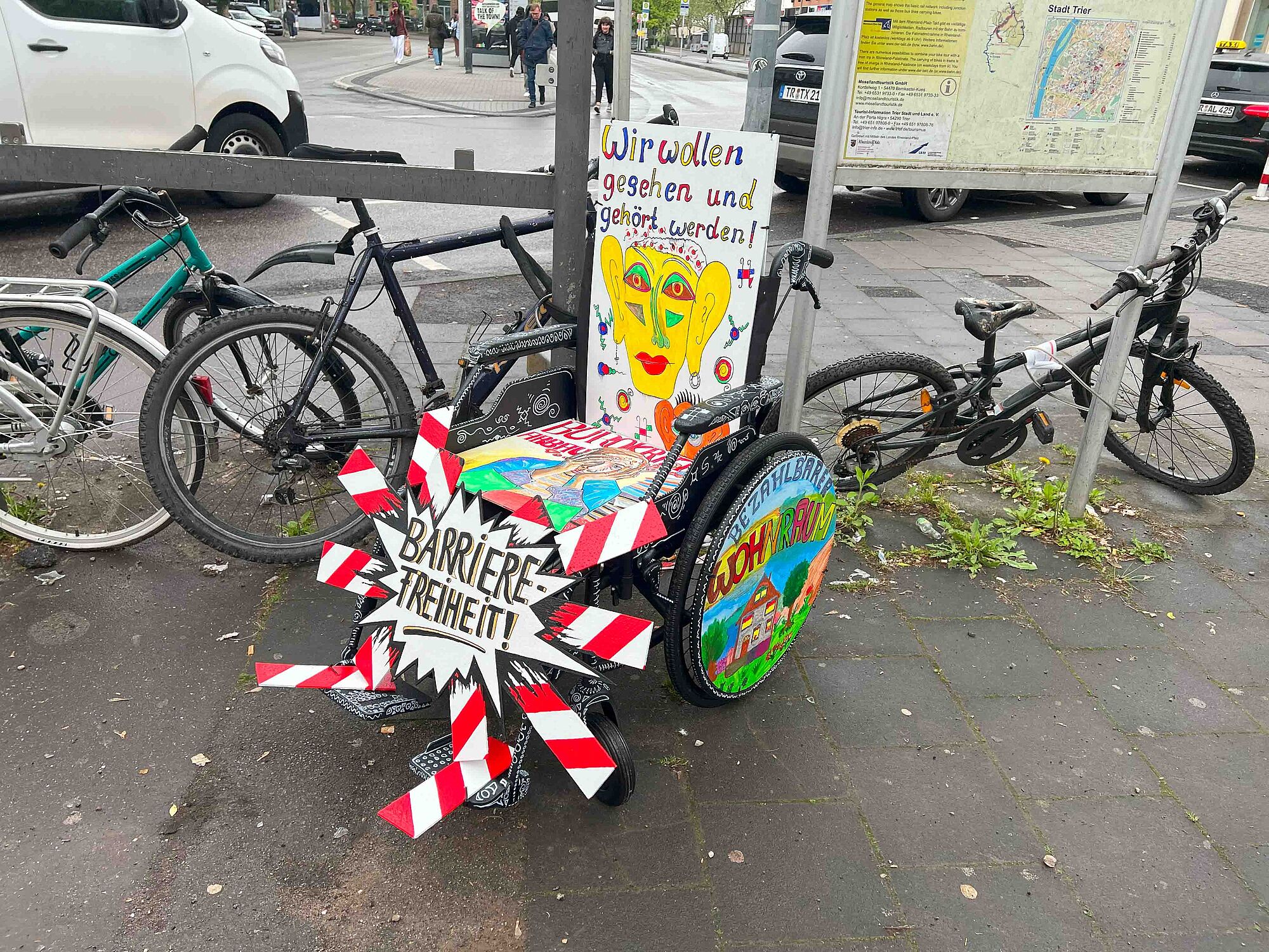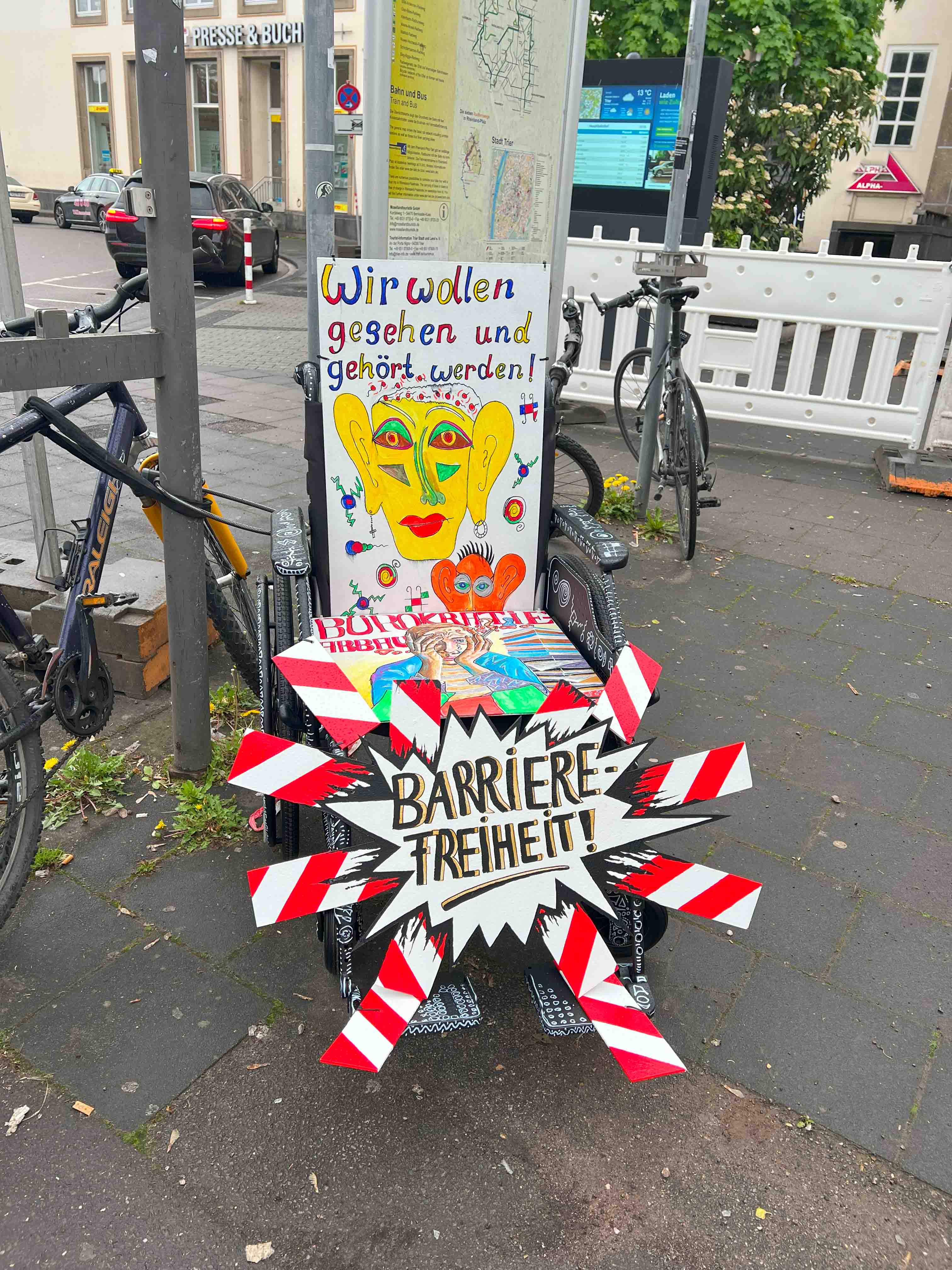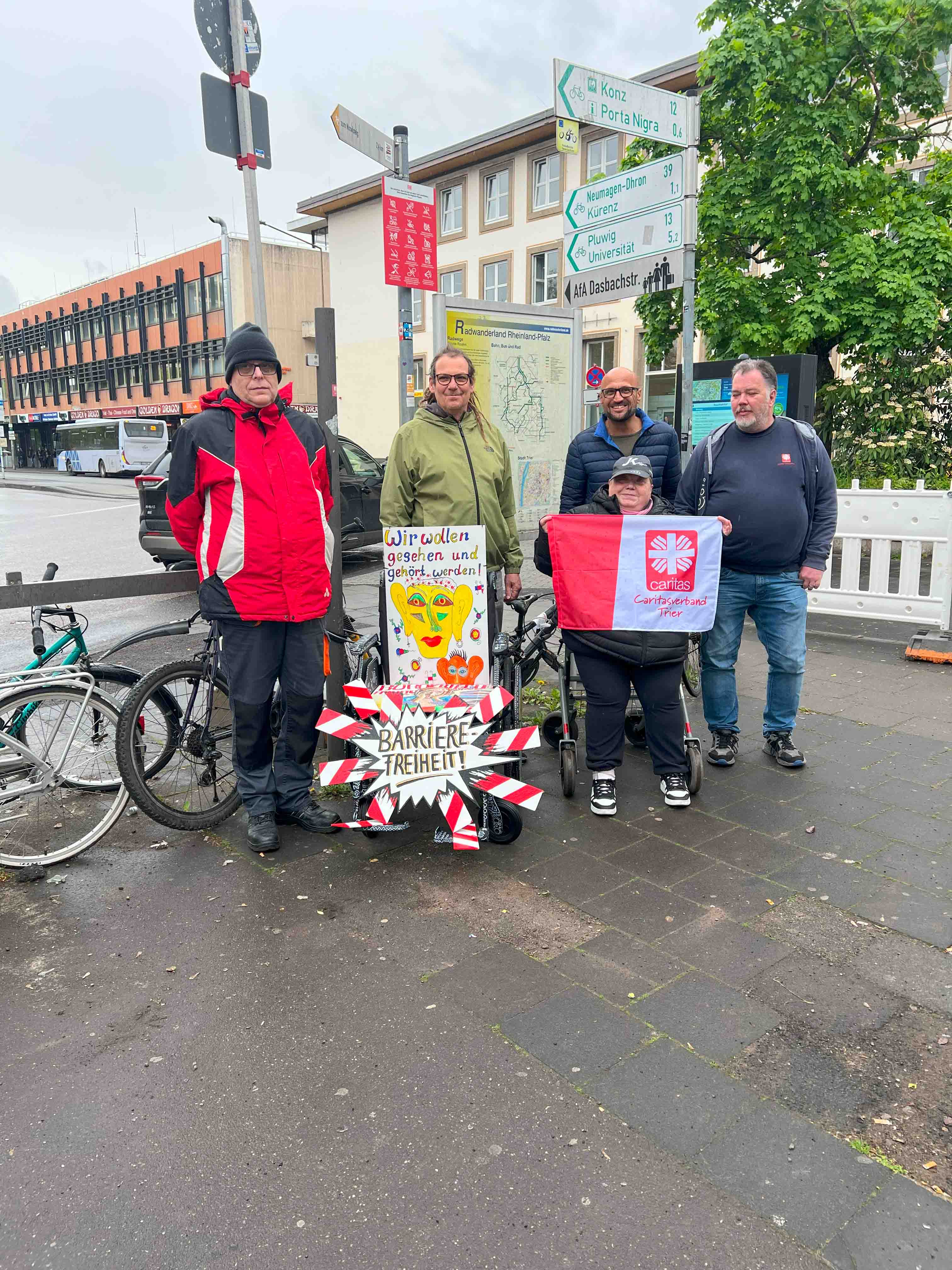 Die Caritas Werkstätten Trier möchten deutlich machen, dass im Miteinander von Menschen mit und ohne Beeinträchtigung noch viel im Argen liegt. Mit ihrem Rollstuhl-Projekt, das am Hauptbahnhof in Trier steht, wollen sie auf Missstände im Alltag hinweisen und für mehr Bewusstsein im Umgang mit beeinträchtigten Menschen sorgen. Integration und Inklusion dürfen keine leeren Worte bleiben – wir fordern echte, gleichberechtigte Teilhabe am gesellschaftlichen Leben. Es geht um ein respektvolles Miteinander auf Augenhöhe: dazugehören, nicht nur dabei sein. Alle sollen im Alltag und Berufsleben wahrgenommen und ernst genommen werden. Dazu gehört der Abbau von physischen Barrieren ebenso wie von bürokratischen Hürden. Auch bezahlbarer Wohnraum und stärkere politische Vertretung unserer Interessen sind zentrale Anliegen. Ein konkretes Beispiel ist der Hauptbahnhof in Trier, wo der Rollstuhl der Caritas Werkstätten steht: Die Einstiege in Busse und Bahnen sind oft zu hoch. Nicht immer hilft jemand mit der Rollstuhlrampe, und für Menschen mit Sehbeeinträchtigung ist es schwer zu erkennen, welcher Bus gerade einfährt. „Mit Kreativität, Engagement und viel Freude haben wir dieses Projekt genutzt, um unsere Perspektiven, Wünsche und Sorgen sichtbar zu machen – und um zum Nachdenken und Mitgestalten anzuregen,“ sagt Marc-Oliver Soler, Werkstattleiter bei den Caritas Werkstätten.